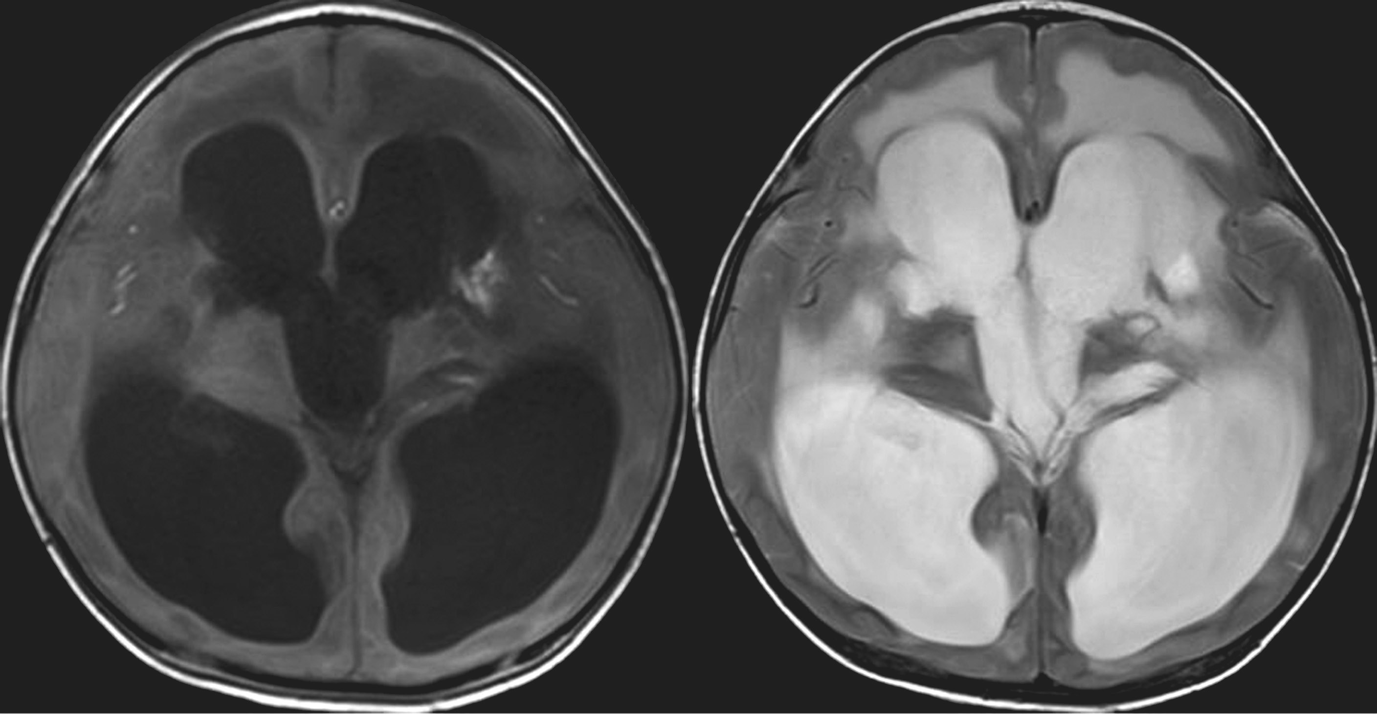 ①脑室系统明显扩大,蛛网膜下腔消失;②脑室额角和/或颞角呈圆形,伴脑室周围呈低或等T 1 信号、高T 2 信号的间质性水肿带;③第三脑室呈球形扩大,视隐窝和漏斗隐窝变浅变钝;④胼胝体位置抬高。