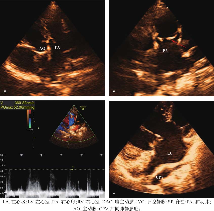 A.上腹部横切面显示腹主动脉和下腔静脉均位于脊柱左侧,下腔静脉在前,腹主动脉在后;B.四腔心切面显示十字交叉结构消失,房间隔下部至室间隔上部可探及回声失落,并见共同房室瓣启闭;C.四腔心切面显示前桥瓣腱索骑跨,并系于室间隔右心室面(箭头);D.剑突下切面瓣口水平心室短轴切面显示共同房室瓣启闭;E.流出道切面显示肺动脉和主动脉均发自解剖学右心室;F.肺动脉瓣增厚,回声增强,开放受限,呈圆顶征(箭头);G.舒张期肺动脉瓣反流速度约360.82cm/s,估测平均肺动脉压约52.08mmHg;H.左心房房壁未探及肺静脉切迹,左心房后方探及四支肺静脉引流入共同肺静脉腔。