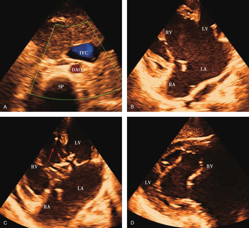 右心、左心房扩大。室间隔与左心室室壁厚度正常,运动幅度正常。房间隔下部至室间隔上部可探及宽约40mm回声失落,探及共同房室瓣环及共同房室瓣启闭,前桥瓣腱索骑跨,系于室间隔右心室面。流出道切面见肺动脉和主动脉均发自解剖学右心室,肺动脉在左,主动脉在右,肺动脉瓣增厚,回声增强,开放受限。左心房房壁未探及肺静脉切迹,其后方探及四支肺静脉均引流入共同肺静脉腔。主动脉弓降部未见明显异常。心包无异常。见图13-1。