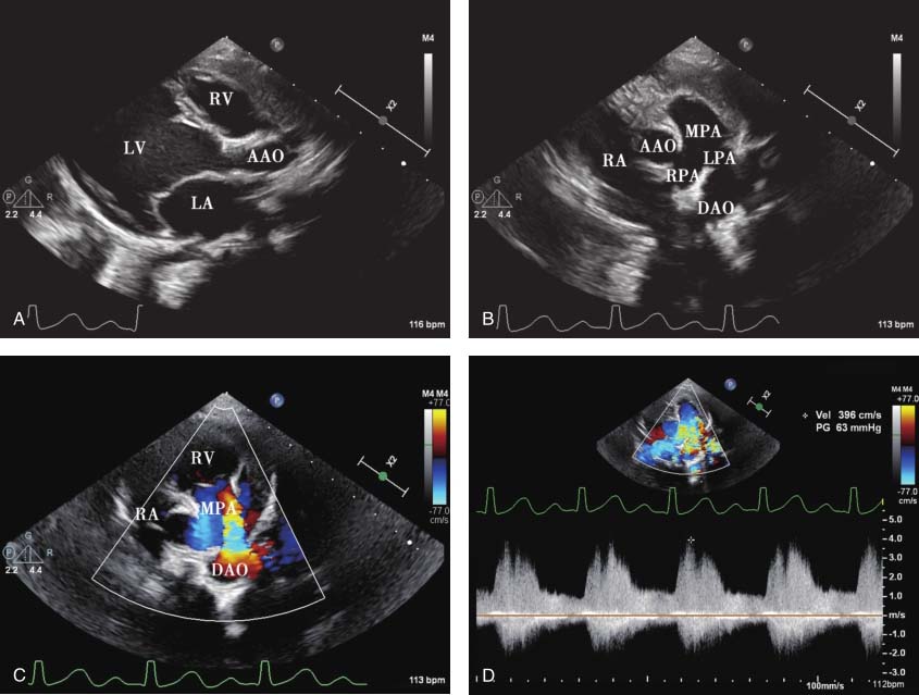 动脉水平探及左向右连续性分流信号,峰值流速396cm/s,峰值压差63mmHg。二尖瓣中量反流,缩流颈宽约3.7mm。见图15-1。