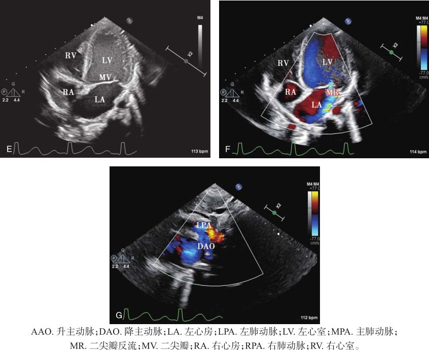A.胸骨旁左心室长轴切面显示左心房、左心室内径增大,右心室内径正常;B.胸骨旁肺动脉长轴切面显示降主动脉与左肺动脉开口之间未闭的动脉导管,为管型,降主动脉侧和肺动脉侧内径相近;C.胸骨旁肺动脉长轴切面彩色多普勒显示降主动脉与左肺动脉之间左向右连续性分流信号;D.连续多普勒测量降主动脉与左肺动脉之间分流峰值流速为396cm/s,峰值压差为63mmHg;E.心尖四腔心切面显示二尖瓣环扩大,瓣叶对合缘减小;F.彩色多普勒显示二尖瓣中量反流;G.胸骨上窝切面彩色多普勒显示降主动脉与左肺动脉之间左向右连续性分流信号。