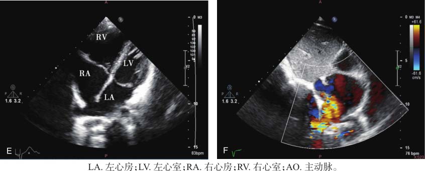 A.左心室长轴切面显示右心房及右心室增大;B.四腔心切面显示右心房及右心室增大,三尖瓣少量反流;C.三尖瓣反流频谱估测肺动脉压力;D.非标准四腔心切面彩色多普勒显示右中肺静脉回流入右心房;E.二维超声非标准四腔心切面显示房顶部房间隔缺损;F.剑突下双心房切面彩色多普勒显示心房水平左向右分流。