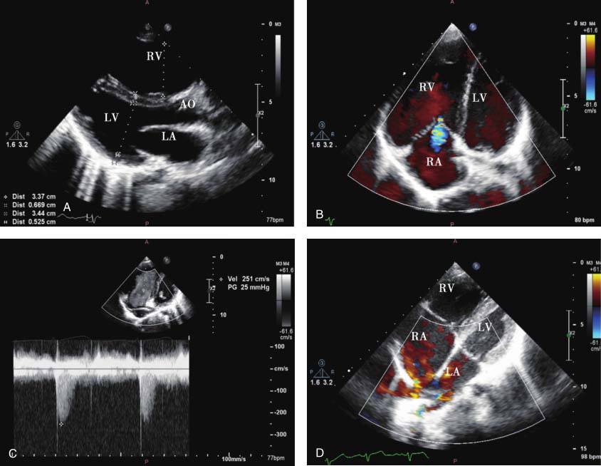 心房水平左向右分流,右中肺静脉回流入右心房。二尖瓣微量反流。三尖瓣少量反流,估算肺动脉收缩压为30mmHg。见图22-1。