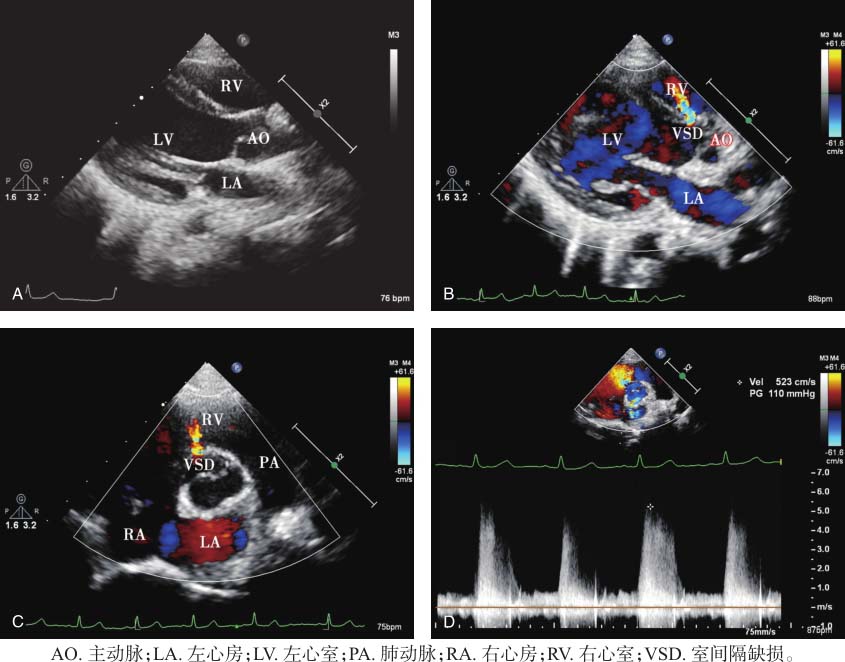 A.胸骨旁左心室长轴切面显示左心房、左心室及右心室内径大致正常;B.胸骨旁左心室长轴切面彩色多普勒显示左向右分流信号;C.胸骨旁大动脉短轴切面彩色多普勒显示左向右分流信号;D.连续多普勒测量左向右分流峰值流速523cm/s,峰值压差110mmHg。