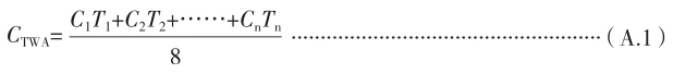 A.2.2.2 定点检测也是测定 TWA 的一种方法,主要反映工作场所空气中化学有害因素的浓度,也反映劳动者的个体接触水平。应用定点检测方法测定 TWA 时,应采集一个工作日内某一工作地点、各时段的样品,按各时段的持续接触时间与其测得的相应浓度乘积之和除以8,得出一个工作日的接触化学有害因素的时间加权平均接触浓度( C TWA )。可按公式(A.1)计算。