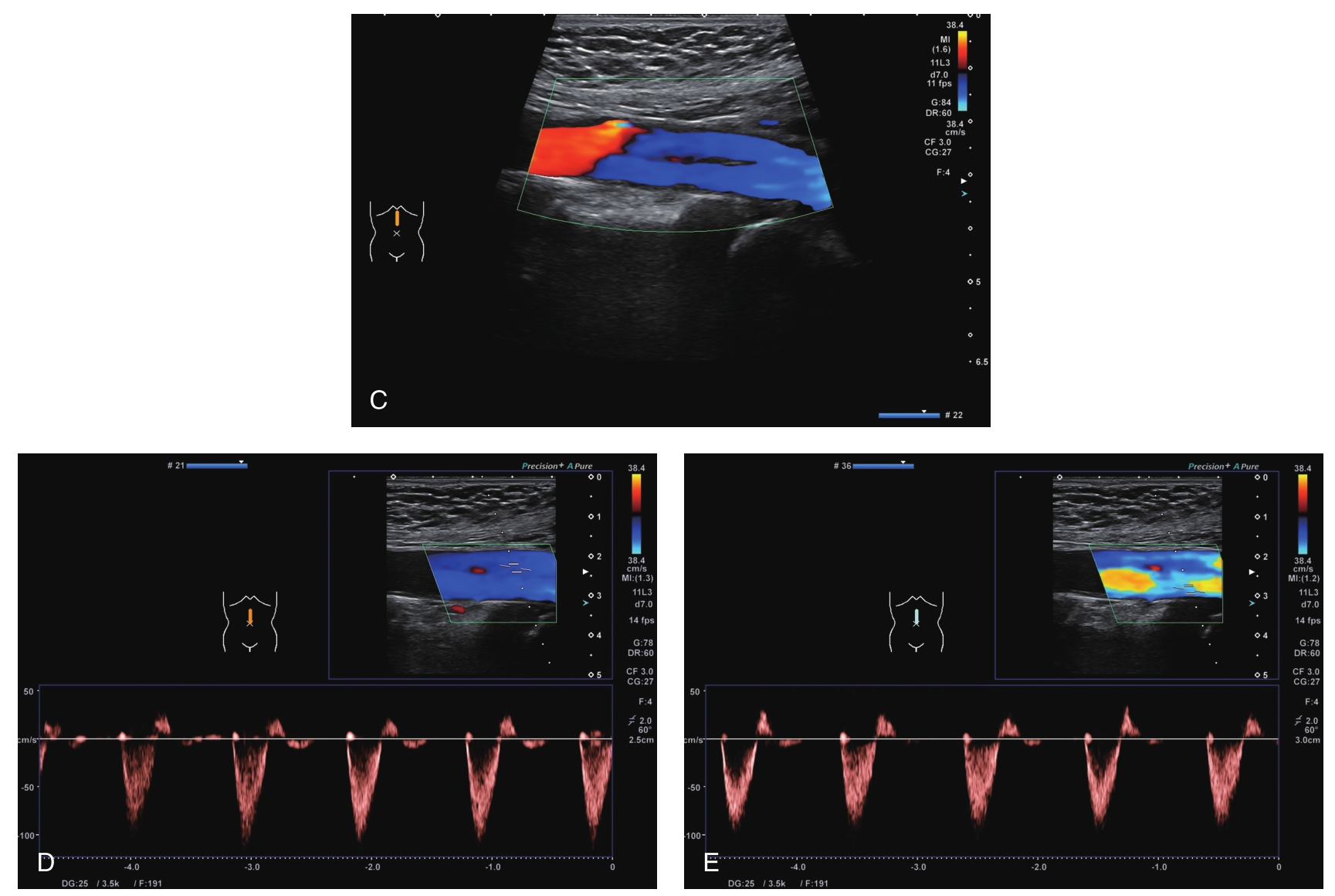 CDFI及脉冲多普勒超声表现见图9-1C、D、E。