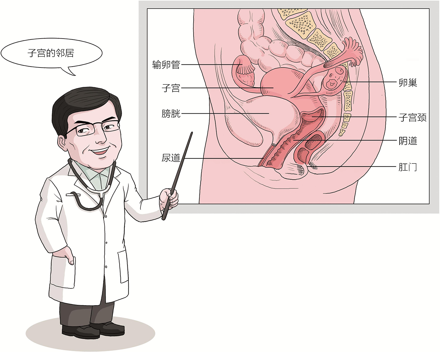 多数女性的子宫体在盆腔中略倒向身体的前方即腹壁的方向,即前倾。宫颈位于阴道的顶端。要想保持子宫的正常位置,需要很多得力的助手,包括子宫的韧带、盆底肌肉以及筋膜的支托。子宫韧带包括阔韧带、圆韧带、主韧带以及宫骶韧带。阔韧带如双翼般自子宫侧壁延伸至骨盆壁,固定子宫、限制子宫向两侧倾斜;圆韧带呈圆索状自宫角前面发出,经盆壁、腹股沟止于大阴唇,协助维持子宫的前倾位置;主韧带在阔韧带下方,横行于子宫颈两侧与骨盆侧壁,是固定子宫颈位置、限制子宫脱垂的主要结构;宫骶韧带位于子宫体与子宫颈交接的后面的侧上方,向后包绕直肠止于骶骨筋膜,向后向上牵拉子宫颈,协助维持子宫前倾姿势。而盆底肌肉和筋膜就如同手掌一样撑起子宫,使牵拉子宫的韧带免受过度牵拉。如果因妊娠分娩产伤等因素造成盆底肌损伤,盆底肌的支持力不足,子宫的韧带就会承受过多的压力,久而久之韧带被动拉长薄弱,不足以维持子宫的正常位置,子宫会沿着阴道下移,发生子宫脱垂。