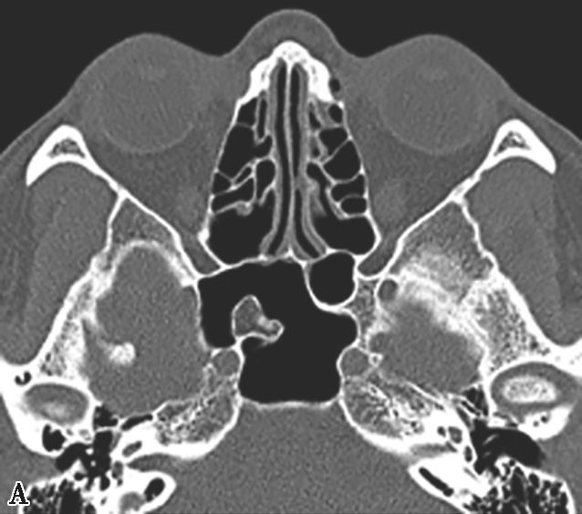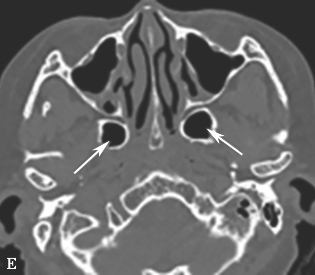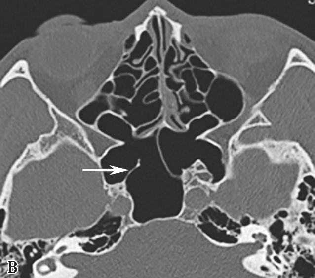 颈内动脉管突入蝶窦内,有时颈内动脉管壁可缺如,在行蝶窦手术时应注意此种情况,避免损伤造成严重的并发症,而这些变异只能根据CT来确定。