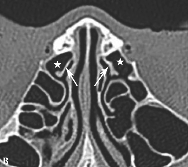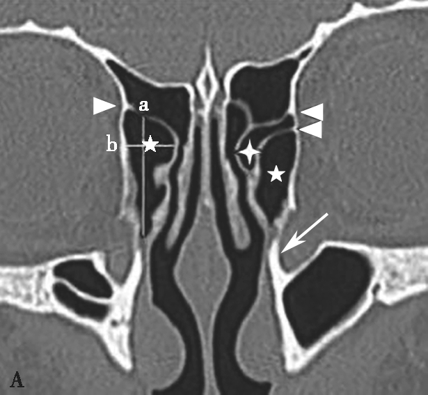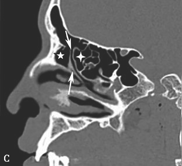 A~C.鼻丘气房(五角星),额气房(星),钩突(白箭),筛骨纸板(箭头)