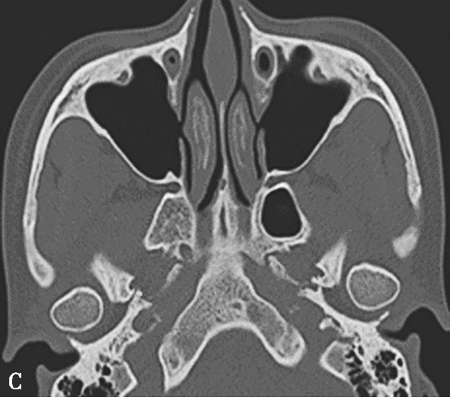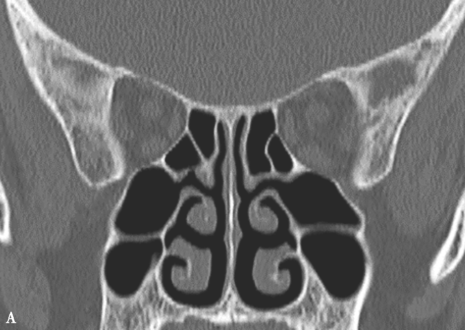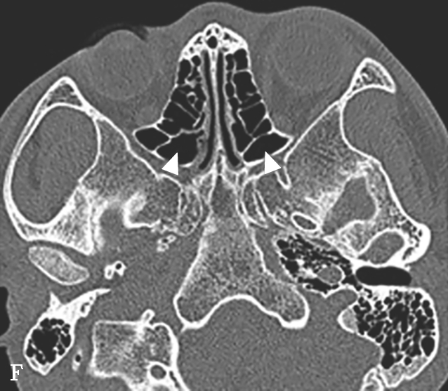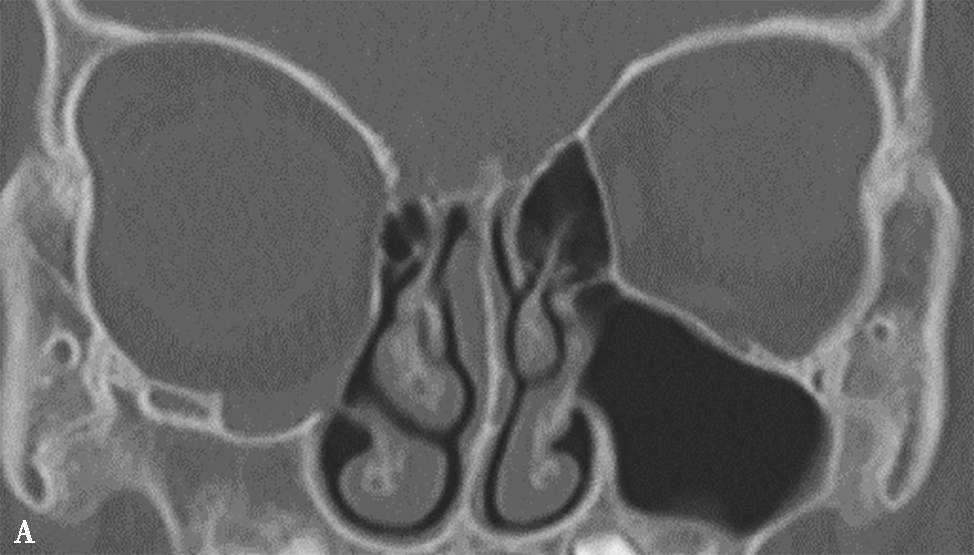 根据CT表现可将其分为三型:一型,只有轻度发育不全,钩突和筛漏斗正常;二型,上颌窦体积轻至中度减小,并有钩突发育不全或筛漏斗缺如;三型,上颌窦缺如,仅由1个嵴组成,并有钩突缺如。上颌窦发育不全的同侧鼻腔和眼眶常扩大。上颌窦不对称在平片上就可显示,但是窦腔较小可被误认为有慢性上颌窦炎的窦腔,尤其当患者有持续性上呼吸道症状时更易误诊。