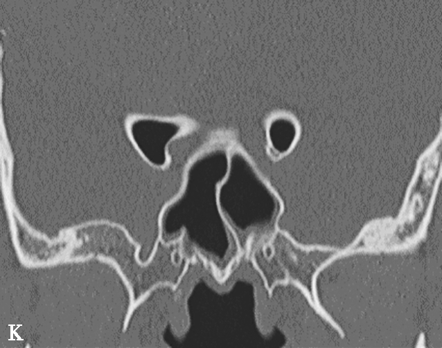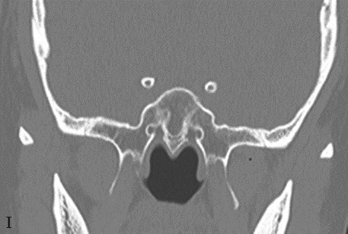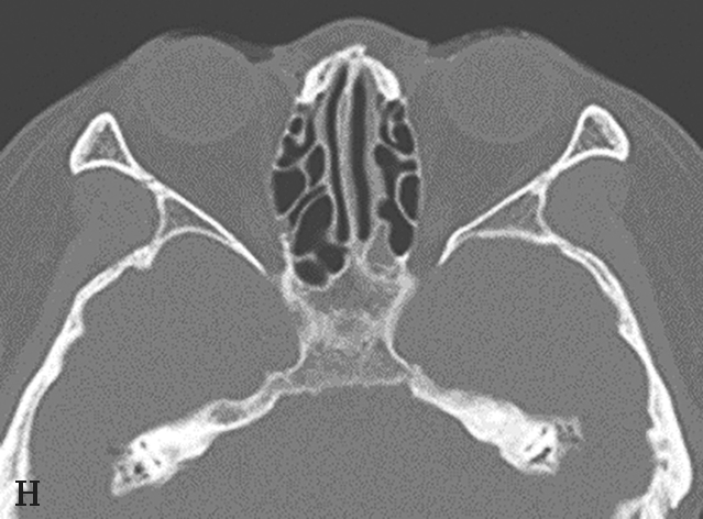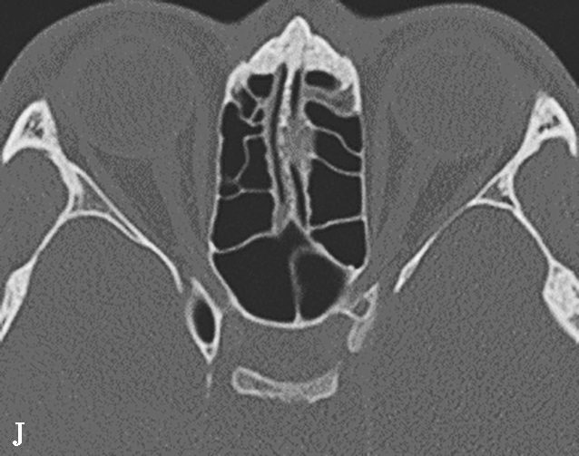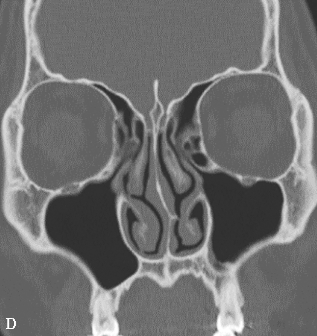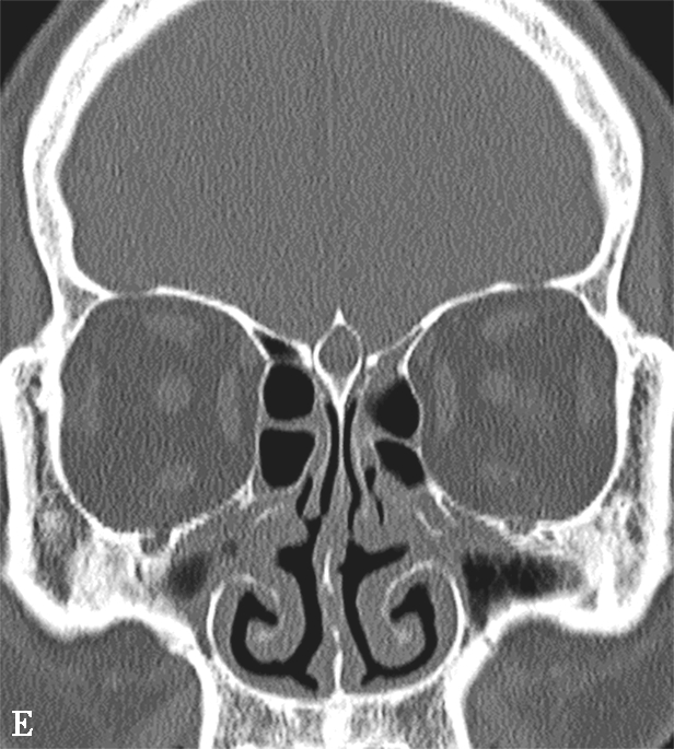 鼻窦过度气化、未发育或发育不良均以额窦最为常见,过度气化的额窦可伸展至颧突,向上至额结节水平以上,或超过眶顶至视神经孔(图1-3-9A),未发育或发育不良的额窦表现为额窦间隔缺如,只有单侧一个额窦窦腔,或双侧额窦窦腔均发育不良(图1-3-9B)。眶上筛房是额窦区域外侧的气房,亚洲人少见,冠状面上表现为随着扫描层面的后移,它的横径逐渐延长(图1-3-9C)。鼻中隔偏曲是指鼻中隔向一侧或两侧弯曲(图1-3-9D),或鼻中隔一侧或两侧局限性凸起,可引起鼻塞、鼻出血以及头痛。鸡冠可以发生气化,引流至额隐窝,如果开口闭塞,鸡冠内可产生黏膜囊肿(图1-3-9E)。