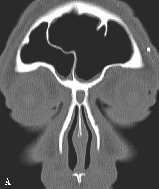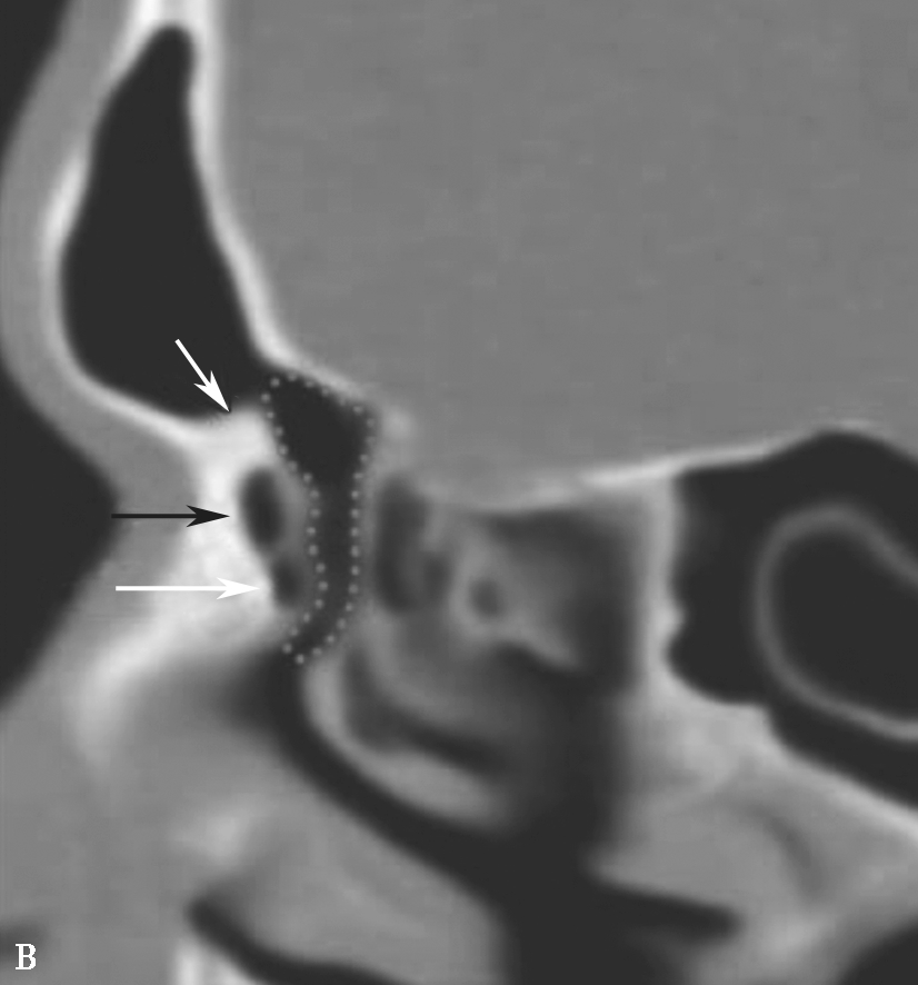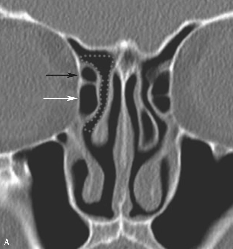 A、B.额隐窝(虚线),鼻丘气房(白箭),额气房(黑箭)