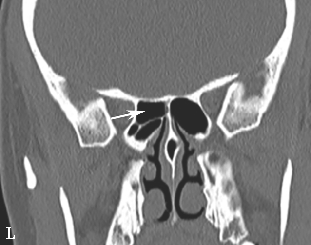 即中组筛房,位于鼻丘后,由1~3个气房构成,内下壁与筛骨钩突间形成半月裂间隙。筛泡过度气化,可能造成筛漏斗及半月裂狭窄,影响引流;过度气化至眶下壁时,称为眶下气房,又称Haller气房,也可能影响上颌窦的引流(图1-3-6)。