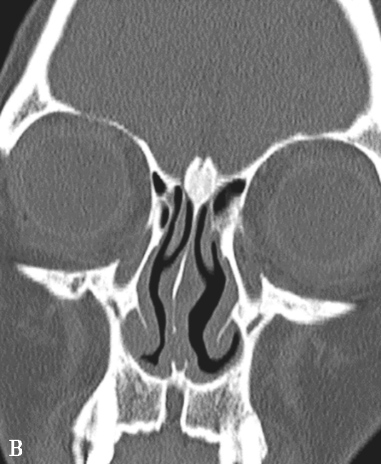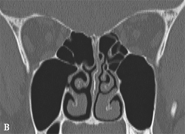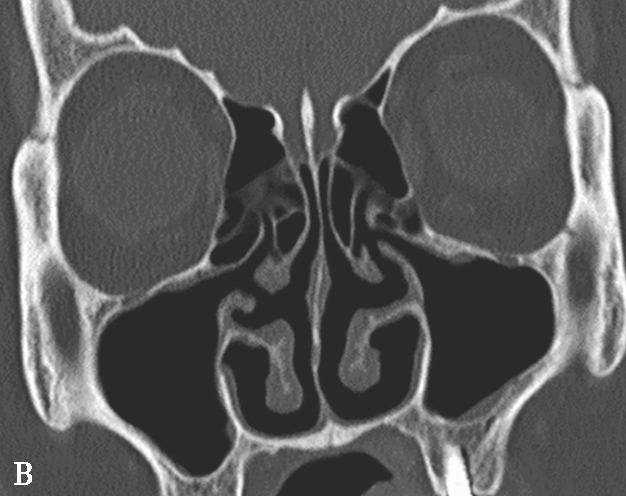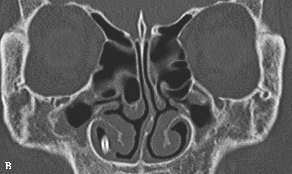中鼻甲为筛骨迷路向内卷曲的骨片,前端起自鼻丘,长约4cm。前1/2较宽,上缘起自筛板外缘,垂直向下,为垂直部,后1/2呈90°弯曲向外,附于筛骨纸板,为水平部,两部之间有一冠状面骨板,称为基板,分隔前、中组筛房与后组筛房。中鼻甲发育过窄,特别是垂直部发育过窄时,中鼻道过宽,半月裂暴露于总鼻道内,易受吸入气体冲击出现黏膜的炎症。