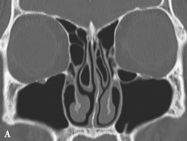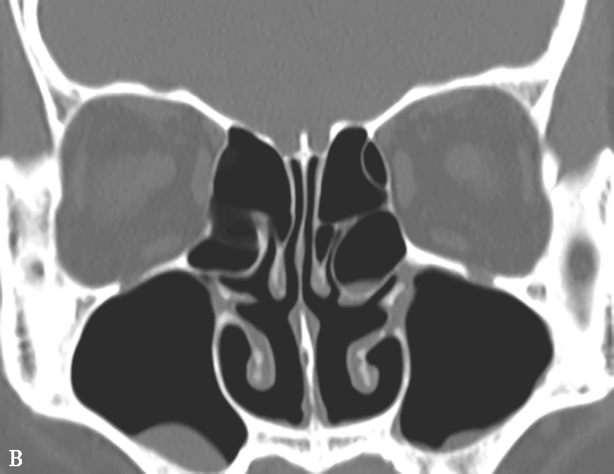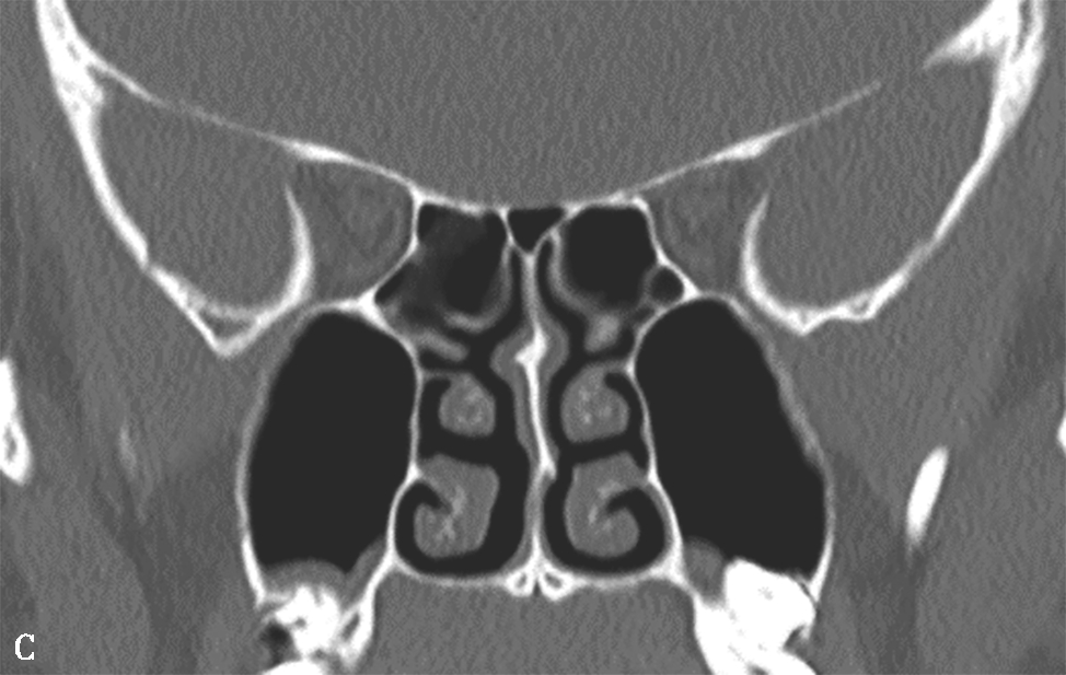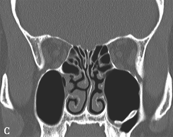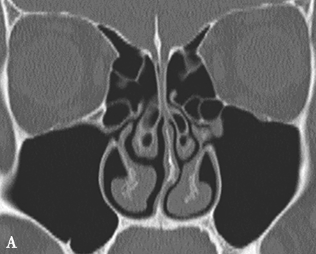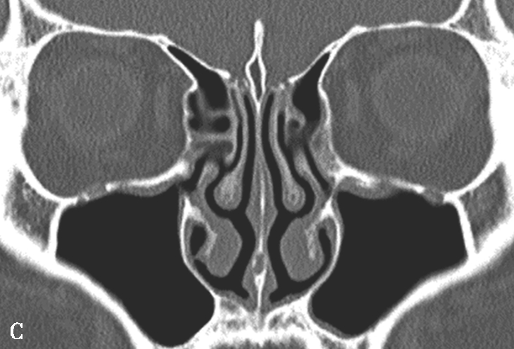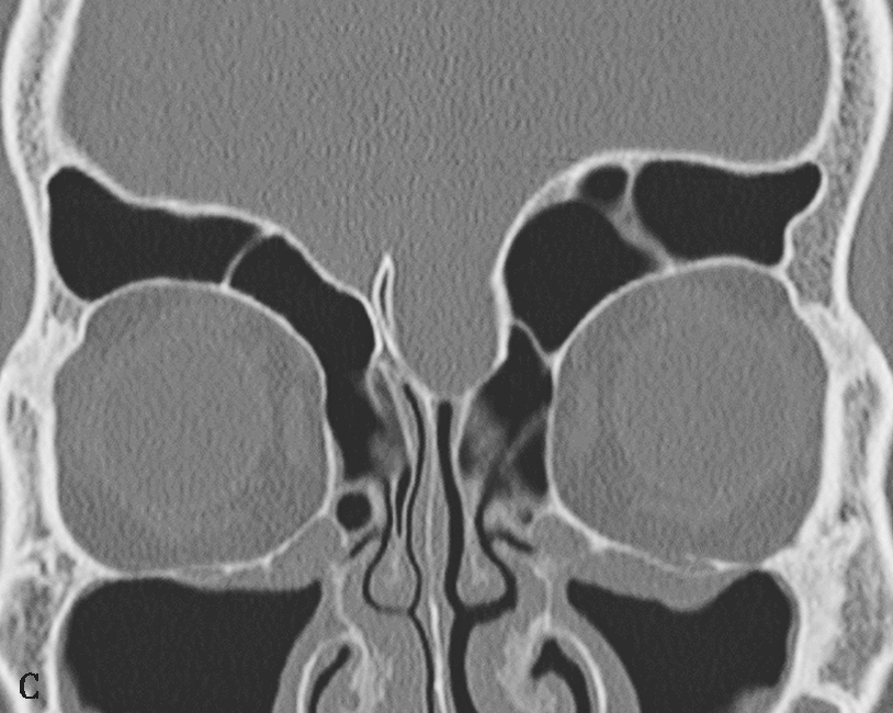 A.双中鼻甲气化;B.左中鼻甲反曲;C.左中鼻甲发育小