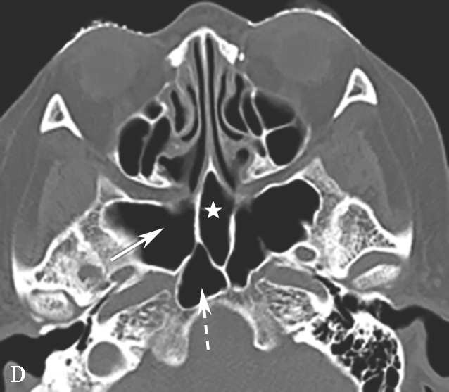 A.颈内动脉管突入蝶窦;B.蝶窦间隔(白箭);C.左侧翼突气化;D.蝶嵴(星)、蝶骨大翼(白箭)、鞍背气化(虚箭);E.蝶骨小翼气化(白箭);F、G.鞍前型蝶窦(三角);H、I.甲介型蝶窦;J、K.鞍型蝶窦;L.Odoni气房(白箭)