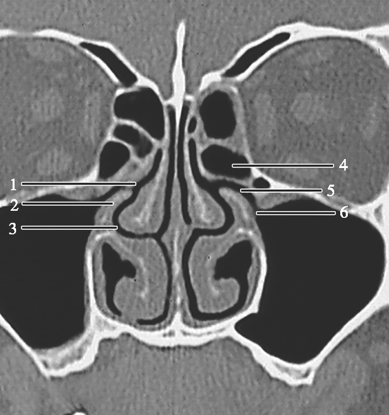 1.半月裂;2.钩突;3.中鼻道;4.筛大泡;5.筛漏斗;6.上颌窦开口