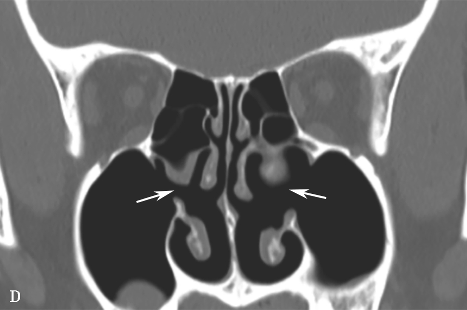为筛骨迷路下部的镰形骨板,前宽后窄,向内上倾斜约45°,后部约2/3上缘游离,与上方相邻的筛泡间形成半月裂。钩突下缘不光整,下缘及后端与上颌骨内侧的上颌窦裂孔下缘与后下缘间的间隙由两层黏膜封闭,缺乏骨性分隔,称为上颌窦囟。可分为前囟与后囟,CT影像上不要误为骨破坏。钩突可发生变异,如肥大、直立,使筛漏斗变窄、向内弯曲,甚至抵在中鼻甲上,造成中鼻道狭窄,可能影响前组鼻窦的引流(图1-3-4)。