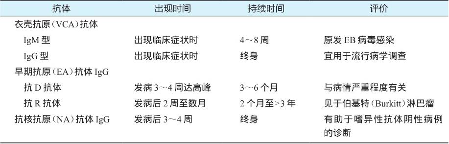表2-6-1 EB病毒抗体出现时间及其评价