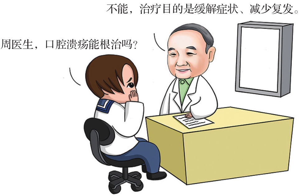 目前该病的病因尚未完全明确,诱发因素繁多,尚没有根治的好办法,但是患者也不用灰心,通过治疗完全可以减轻症状、缓解发作(图2-2)。一般来说,口腔溃疡通过局部治疗即可减轻疼痛,缩短愈合期。如果配合全身用药,则疗效更佳,可以降低溃疡发作的频率。此外,复发性口腔溃疡患者的自我保健应饮食均衡、作息规律、避免精神紧张,从而减少口腔溃疡发作。