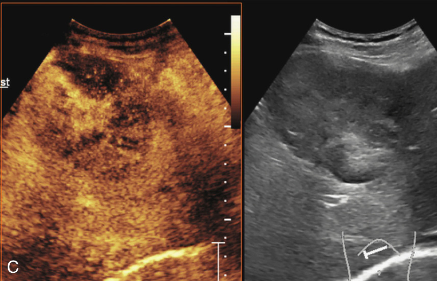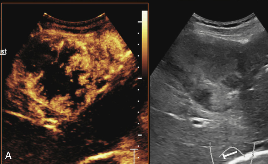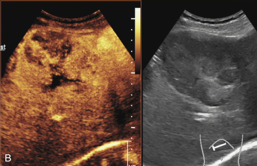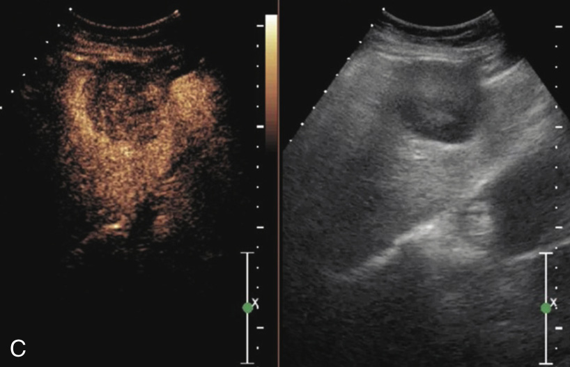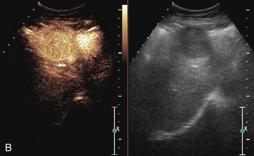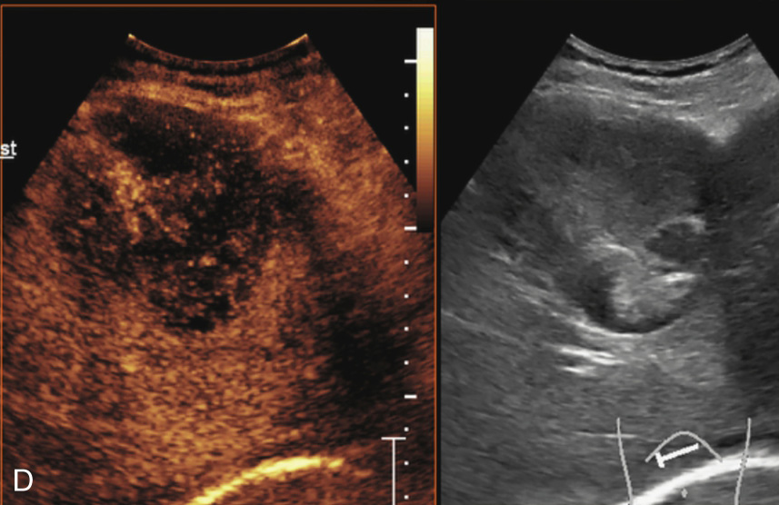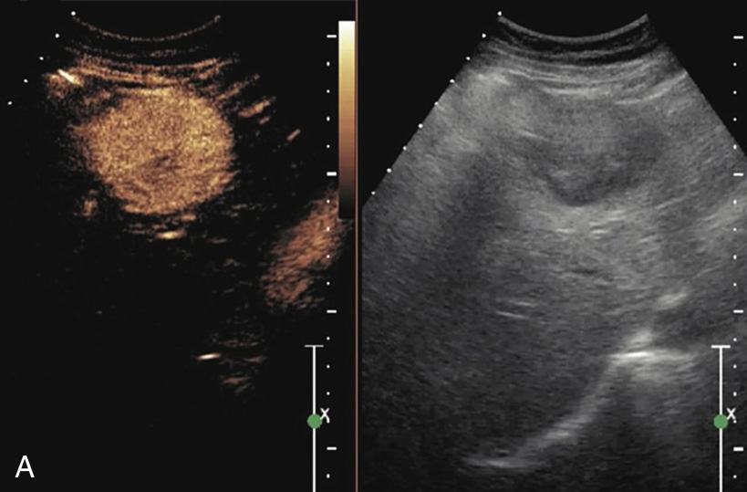 (6)超声造影:表现为“快进快出”,即注射造影剂后动脉期病灶呈均匀或不均匀高增强,门脉期或延迟期呈低增强(图1-7-3)。