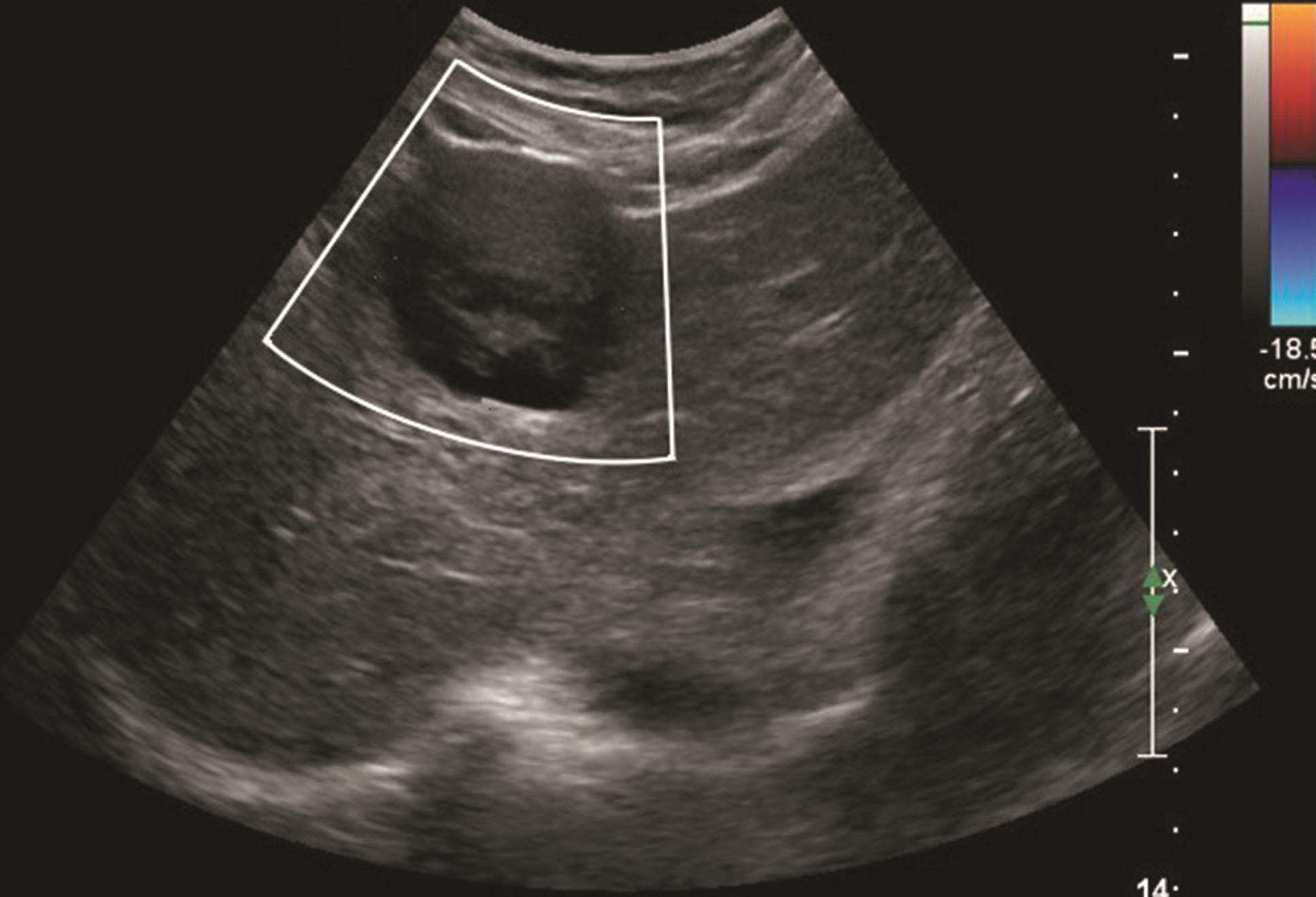 病灶以实质性低回声为主,也可呈高回声或等回声,分布不均匀。肝内局部区域的胆管内径增宽,部分病例可不出现胆管扩张(图1-7-4)。