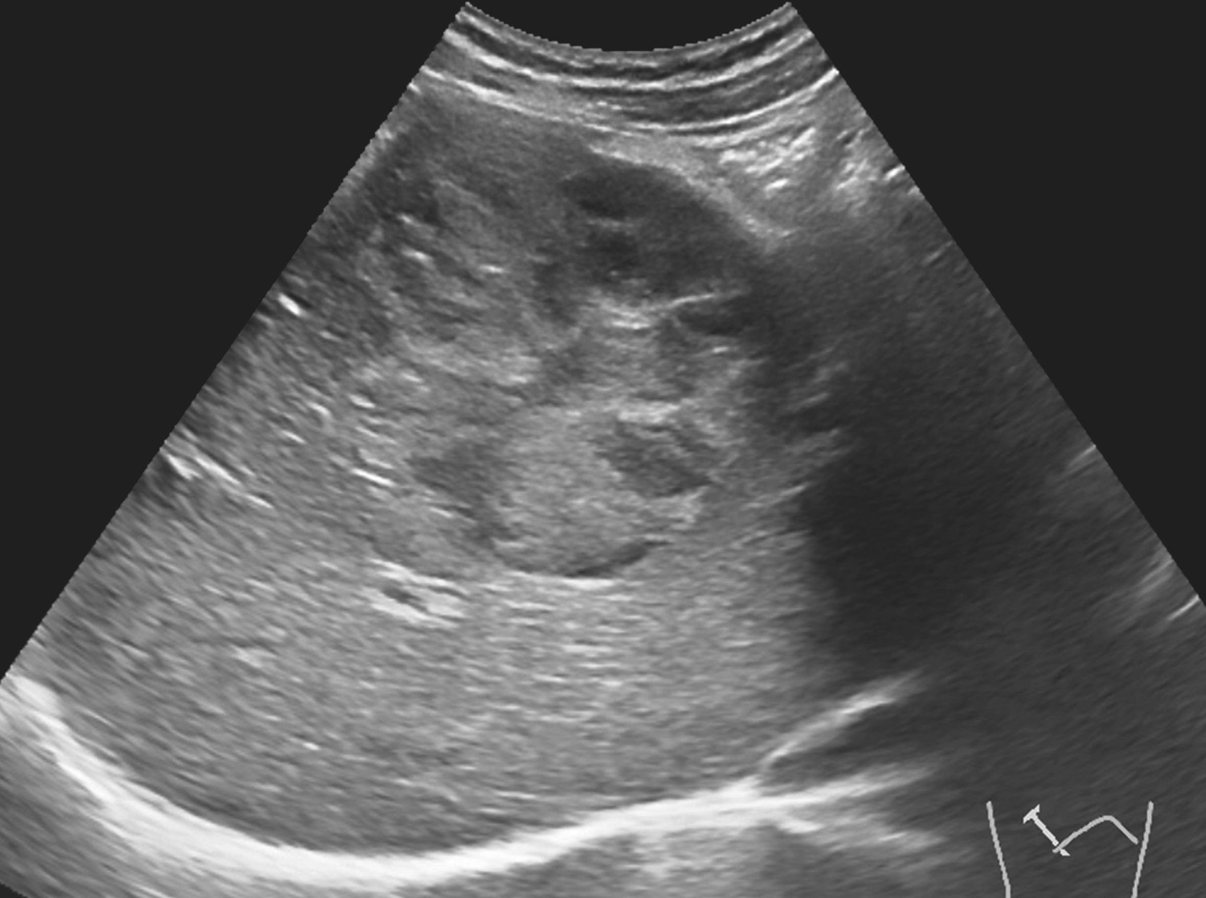 肝右叶见较大混合回声,形态不规则,边界欠清