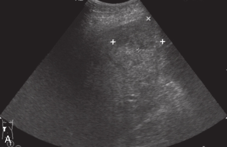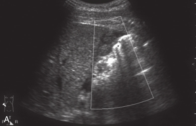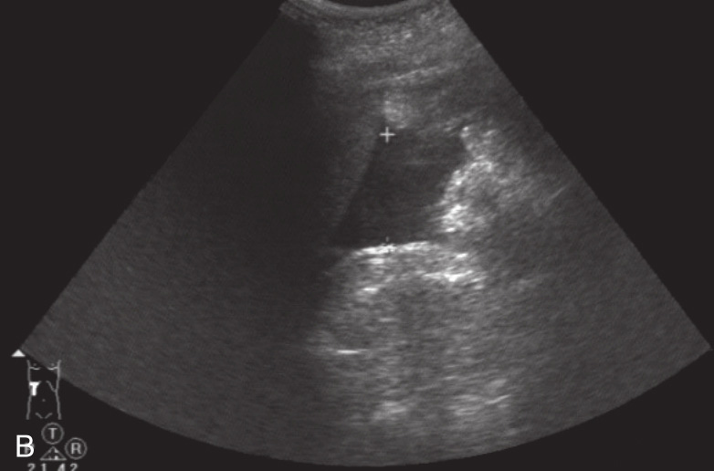 A.肝右叶近被膜处片状低回声区;B.肝下积液