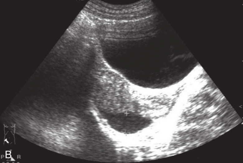 A.肝右叶片状低回声区,其内血流信号不明显;B.盆腔少量积液