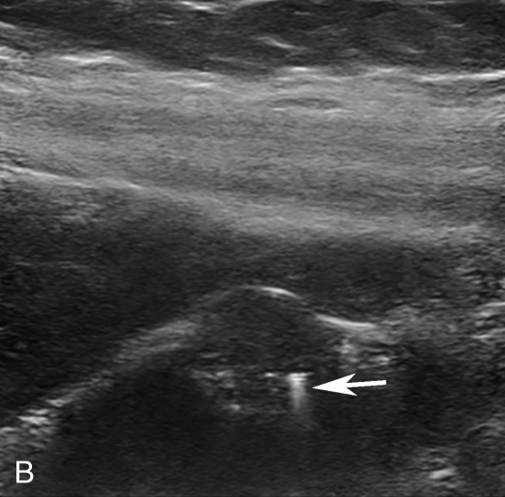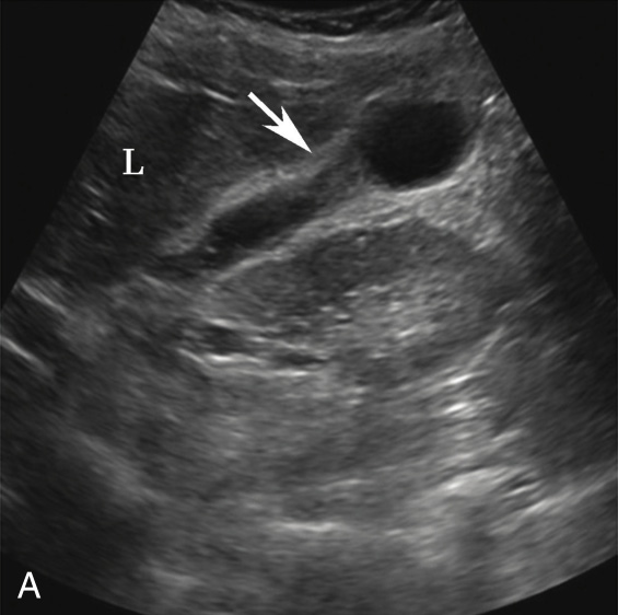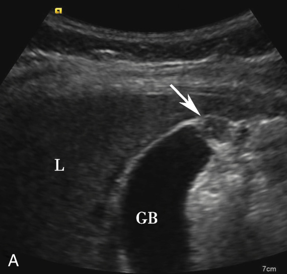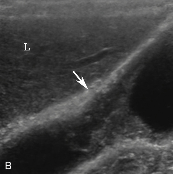 A.灰阶超声显示胆囊体部壁增厚(箭头所示),呈葫芦形;B.采用高频探头显示增厚处胆囊壁(箭头所示)