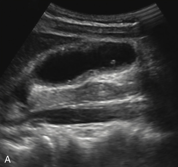 好发于胆囊体部,胆囊壁呈节段型增厚,向腔内突入,灰阶超声图像呈“三角征”(图2-4-2)。