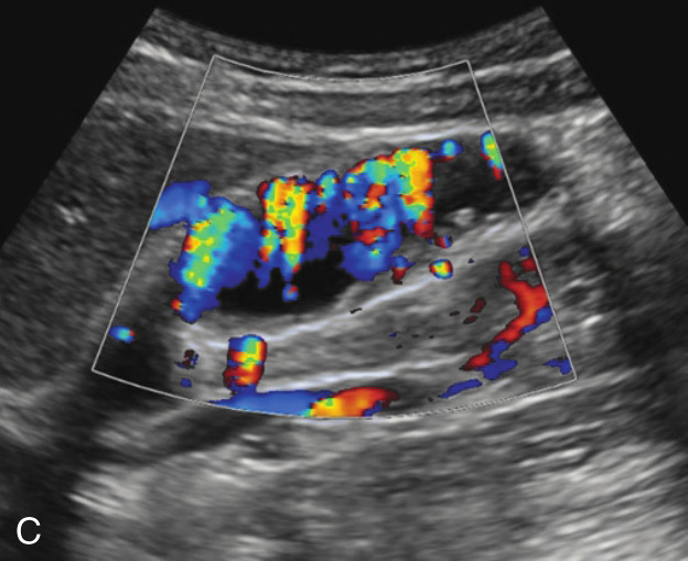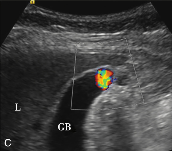 A.胆囊壁呈弥漫性增厚;B.高频超声显示增厚的胆囊壁上可见多发点状强回声;C.CDFI显示“快闪伪像”