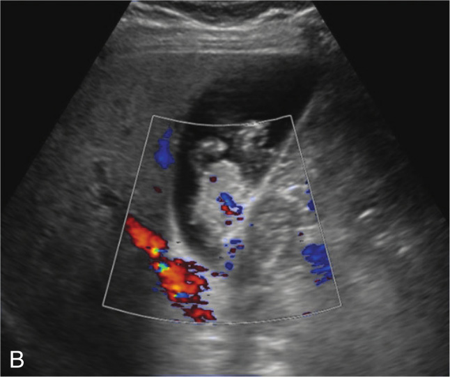 A.胆囊壁可见高回声结节,最大径2.8cm;B.CDFI显示结节内可见血流信号