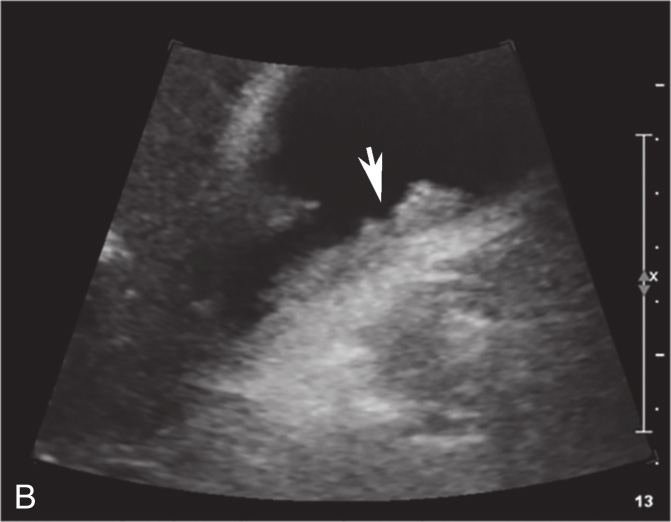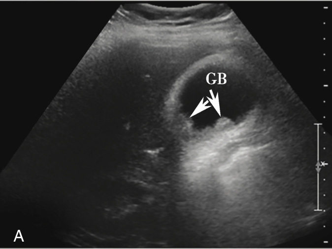 A.胆囊颈部壁局限性增厚,回声不均(箭头所示)