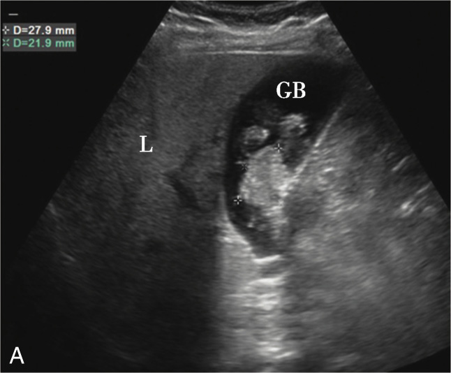 胆囊窝处表现为不均匀回声的实性肿块,胆囊腔内的无回声消失或基本消失。CDFI可见血流信号。