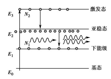 但在粒子体系中,有些粒子的寿命很短暂,是不能用来做工作物质的,而有些粒子的寿命相对较长些,这些粒子能级叫做亚稳态能级,亚稳态能级可以在一定时间内与某一能级实现粒子数反转,以达到对特定频率的辐射光进行光放大。光放大仅仅靠粒子数反转还是不够的,同时还需要对亚稳态能级粒子体系(主要工作物质)增加某种外部的作用。这是由于在热平衡的分布中,处于高能级的粒子数总是少于处在低能级上的粒子数,想要实现粒子数反转,就得给粒子体系增加某种外部的作用,促使大量低能级的粒子反转到高能级,这个过程被叫做激励。