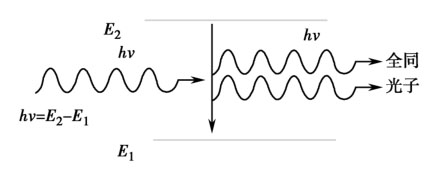 处于高能级的粒子,在某种频率( v )的光子诱发下,从原来所在的能级 E 2 上跃迁至低能级 E 1 上,能量减少△ E = hv ,放出与外来光子完全相同的光子,此时产生了一个光子(受激发后共有2个光子),这个过程称为受激辐射(图2-1-4)。