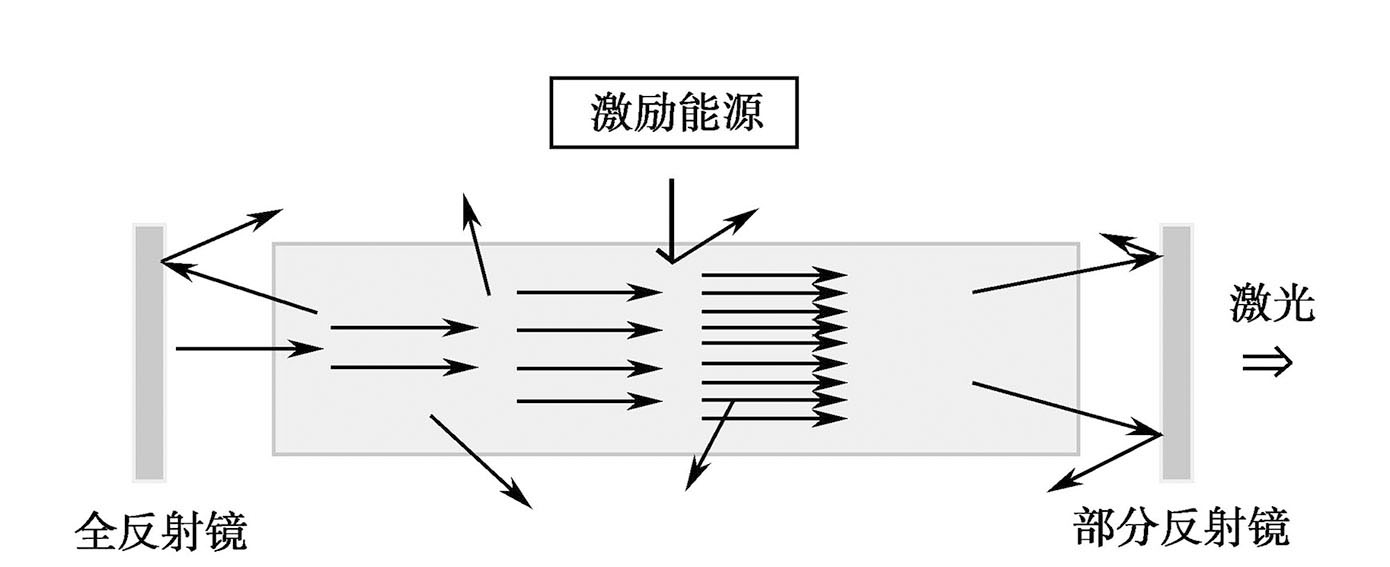 解决自发辐射方向和频率混乱的问题,使其呈单一性的方法就是在工作物质的两侧放置两块反射镜。而且两块反射镜必须彼此平行,并与工作物质的光轴垂直(图2-1-6)。两个反射镜中,一个是全反射镜,反射有效率为99.8%;一个是半反射镜,反射率为40%~60%。谐振腔即指两块反射镜构成的空间。在谐振腔中,初始的光辐射是来自自发辐射,即处于高能级上粒子自发辐射光子跃迁到低能级,所以由于这类辐射出来的光子初相位无规律地向四面八方射出,这种光不是激光。