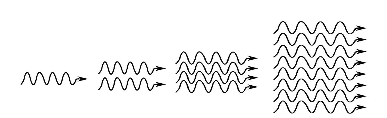 受激辐射的特点是受外来光子的刺激产生,不是自发跃迁的,这与自发辐射不同。受激辐射所释放的光子与外来光子的频率、传播方向、相位及偏振等完全一样,无法区别。受激辐射中由于光辐射的能量与光子数成正比,因而在受激辐射以后,光辐射能量增大一倍。外来光子量越过,受激发的粒子数越多,产生的光子量越大,能量越高。从波动观点来看,假设外来光子为一种波,受激辐射产生的光子为另一种波,由于两个波的相位、振动方向,传播的方向及频率相同,两个波合在一起能量就增大一倍,即通过受激辐射光波被放大(图2-1-5)。
