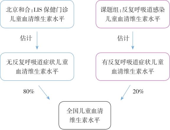 (3)将反复呼吸道感染层的总体层权设定为20%,相应的非反复呼吸道感染层的总体层权设定为80%(注:由于儿童保健门诊为无明显患病症状的健康儿童,而全国儿童中仅有73%的健康儿童,因此推算全国儿童血清维生素A、E水平分布时将高估全国儿童血清维生素A、E的水平)。将两个独立随机样本的分布及其分布特征按各层的总体层权进行加权计算获得总样本的分布及其分布特征。以2016年底的儿童人口作为总体规模(目前已经公布的最新人口统计数据,同时又比较接近跨越几年的数据采集期的中间点)来估计全国儿童中血清维生素A、E缺乏的人数。具体估计步骤如图14: