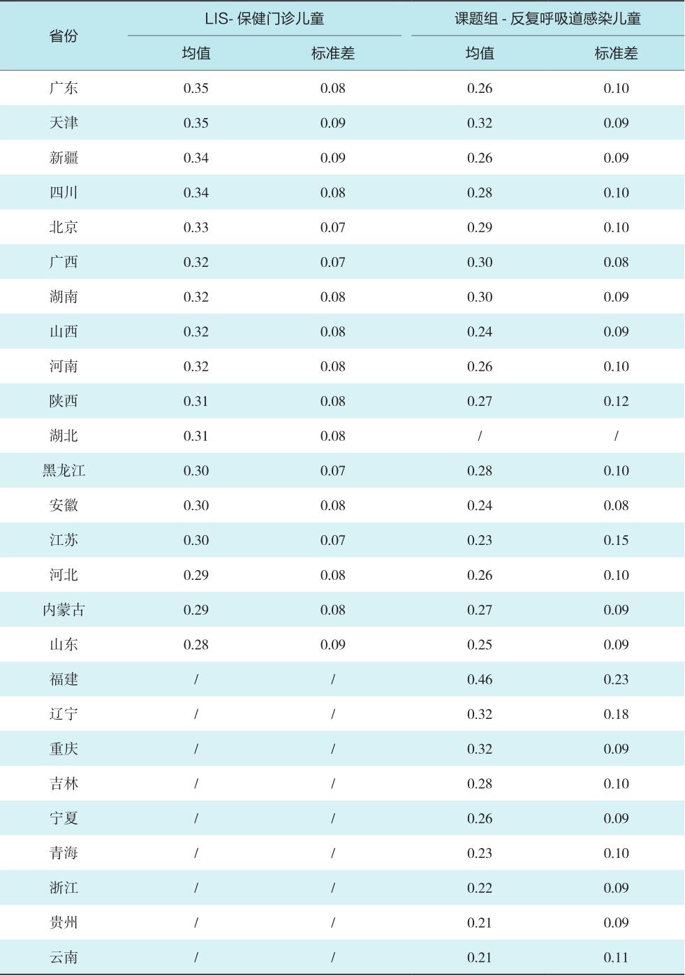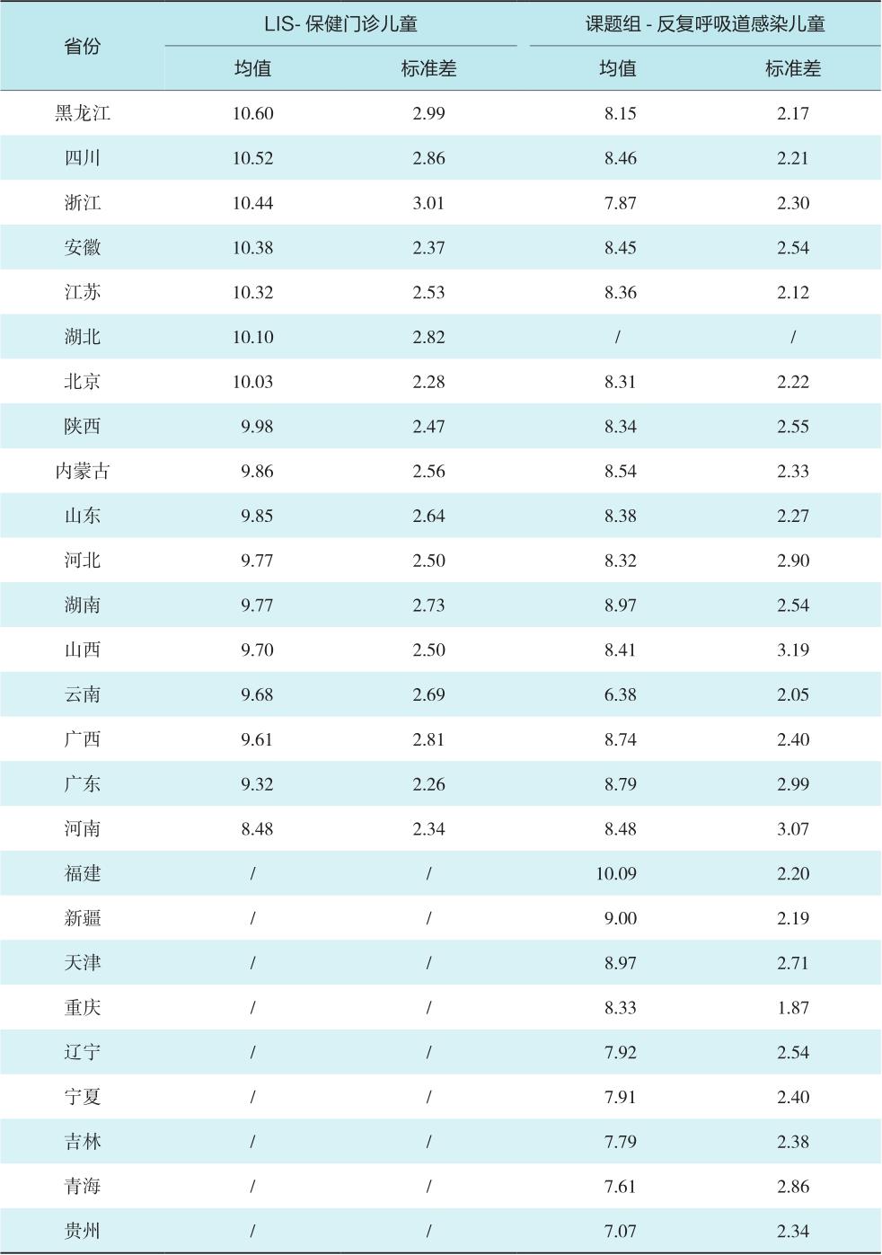 表3 各省市自治区保健儿童和反复呼吸道感染儿童血清维生素A水平的均值及标准差(mg/L)