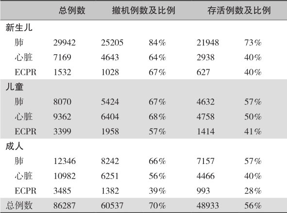 据ELSO数据显示,截至2017年1月(表1-2),四十余年来全球共有86 287例病人接受EMCO支持,共有60 537例成功撤离ECMO,总体撤机率达到70%;48 933例存活出院,总体存活率达到56%。其中新生儿38 643例,约占总病例数45%;儿童20 831例,占总病例数24%;成人病例26 813例,占总病例数31%。虽然从20世纪90年代初期,肺表面活性物质、高频通气和一氧化氮吸入三大呼吸支持技术的出现,需要ECMO支持的呼吸衰竭新生儿病例逐年减少,但累积数据看新生儿呼吸支持病例仍是最多的。总的特点呈现两大特点:一是从支持人群看,新生儿ECMO应用比例逐年下降,儿童和成人比例逐年增加;二是从支持类型看,心脏支持的比重越来越高。成人呼吸支持领域应用增长尤为明显,这与V-V ECMO在重症监护室的应用得到重视有关,而ECMO心脏支持比例的增加与近年来由于心脏外科技术和体外循环技术的进步,越来越多的危重心脏病患者得到手术治疗相关。