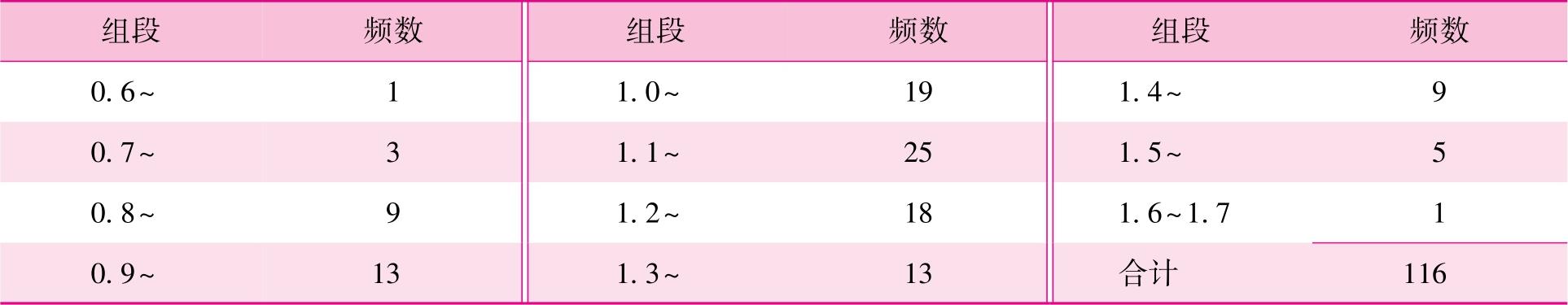 表2-1 某 单位116 名正常成年女子血清甘油三酯(mmol/L)测量结果