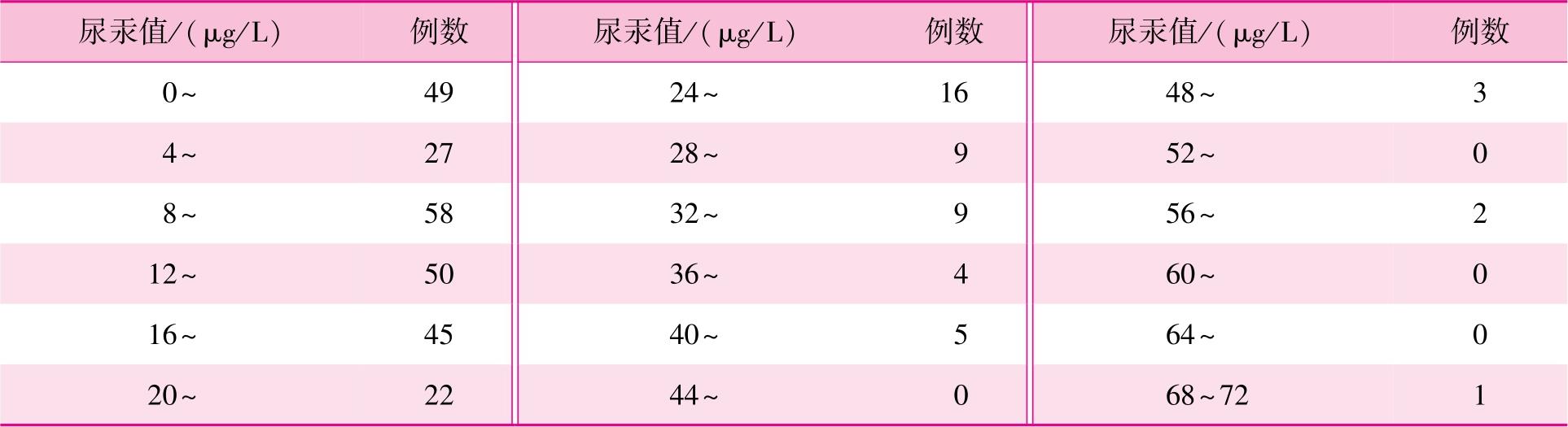 3.测得某地300 名正常人尿汞值的频数表见表2-3。试计算均数和中位数。请问何者的代表性较好?并计算正常人尿汞值的95% 参考值范围。