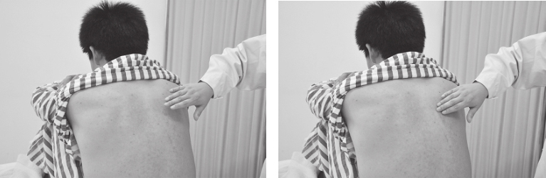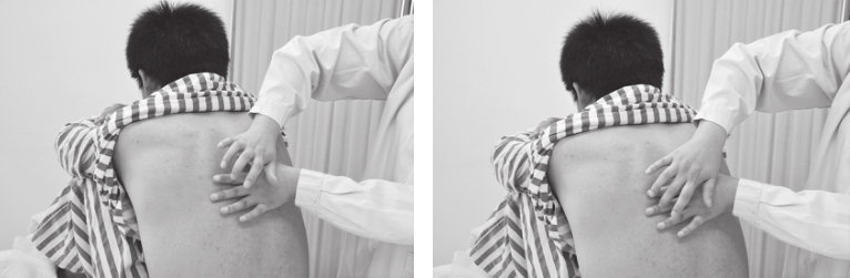 医生右手中间三手指并拢,用其掌面直接拍击被检查部位,借助拍击的反响和指下的振动感来判断病变情况 (图3-1-3) 。直接叩诊法适用于胸部和腹部范围较广泛的病变,如胸膜粘连或增厚、大量胸腔积液或气胸、腹水等。