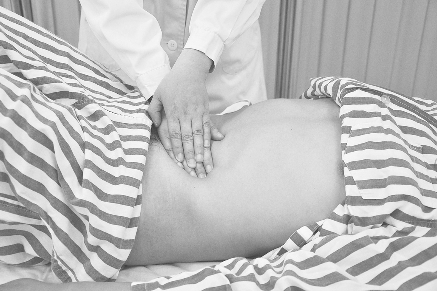 腹部浅触诊可触及的深度约1cm。触诊时,将一手放在被检查部位,用掌指关节和腕关节的协同作用以旋转或滑动的方式轻压触摸。浅部触诊有助于检查腹部有无压痛、抵抗感、搏动、包块和某些肿大脏器等。浅部触诊常在深部触诊前进行,有利于患者做好接受深部触诊检查的心理准备 (图3-1-1) 。