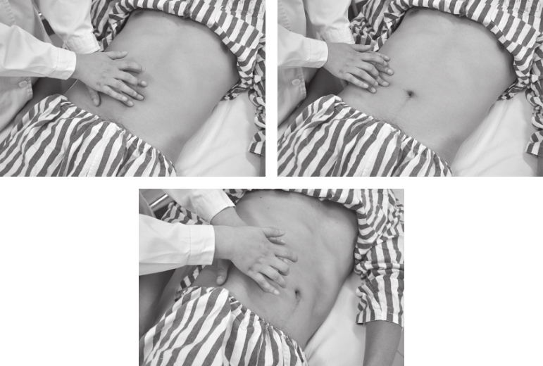 2.检查者应站立于被检查者右侧,面对被检查者,前臂应与腹部表面在同一水平,检查时手要温暖,先以全手掌放于腹壁上部,使患者适应片刻,并感受腹肌紧张度。然后以轻柔的动作按顺序触诊,一般自左下腹开始逆时针方向触诊至右下腹,再至脐部,依次检查腹部各区。原则是先触诊健康部位,逐渐移向病变区域,以免造成患者感受的错觉。边触诊边观察被检查者的反应与表情,对精神紧张或痛苦者给予安慰和解释。亦可边触诊边与患者交谈,转移其注意力有助于减少腹肌紧张,以保证顺利完成检查。