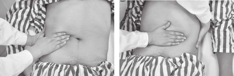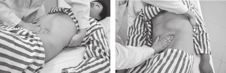 检查肾脏一般用双手触诊法 (图3-5-8) 。嘱患者取仰卧位,两腿屈曲并做较深腹式呼吸。触诊右肾时,医生立于患者右侧,以左手掌托起其右腰部,右手掌平放在右上腹部肋缘稍向下,手指方向大致平行于右肋缘进行深部触诊,于患者吸气时双手夹触肾脏。如触到光滑钝圆的脏器,可能为肾下极,如能在双手间握住更大部分,则略能感知其蚕豆状外形,握住时患者常有酸痛或类似恶心的不适感。触诊左肾时,左手越过患者腹前方从后面托起左腰部,右手掌横置于患者左上腹部,依前法双手触诊左肾。如患者腹壁较厚或配合动作不协调,以致右手难以压向后腹壁,可在患者吸气时,用左手向前冲击后腰部,如肾下移至两手之间时,则右手有被顶推的感觉;与此相反,也可用右手指向左手方向腰部做冲击动作,左手也可有同样的感觉而触及肾脏。如卧位未触及肾脏,还可让患者站立床旁,医生于患者侧面用两手前后联合触诊肾脏。当肾下垂或游走肾时,立位较易触到。