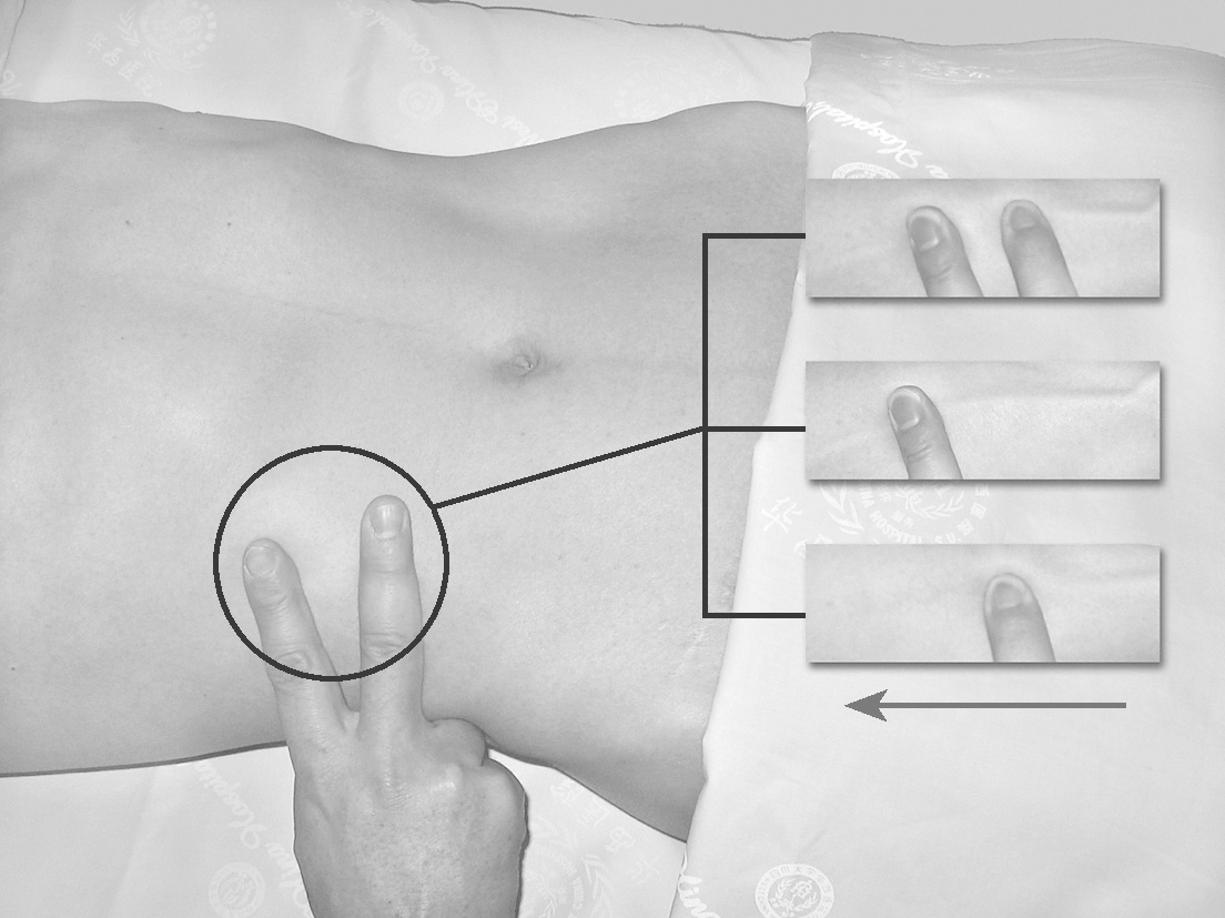 采用指压法可鉴别腹壁曲张静脉的血流方向。选择一段没有分支的腹壁静脉,检查者首先将示指和中指并拢并压在待测试的静脉上,然后一只手压紧,另一手指沿着静脉缓慢向外移动以便挤出该段静脉内血液,然后松开移动的手指,另一手指仍然紧压不动,观察此时静脉是否充盈,如果迅速充盈,则表明血流方向是从松开的一端流向紧压手指的一端。同样的方法松开另一手指,观察静脉充盈速度,即可判断血流方向 (图3-5-2) 。
