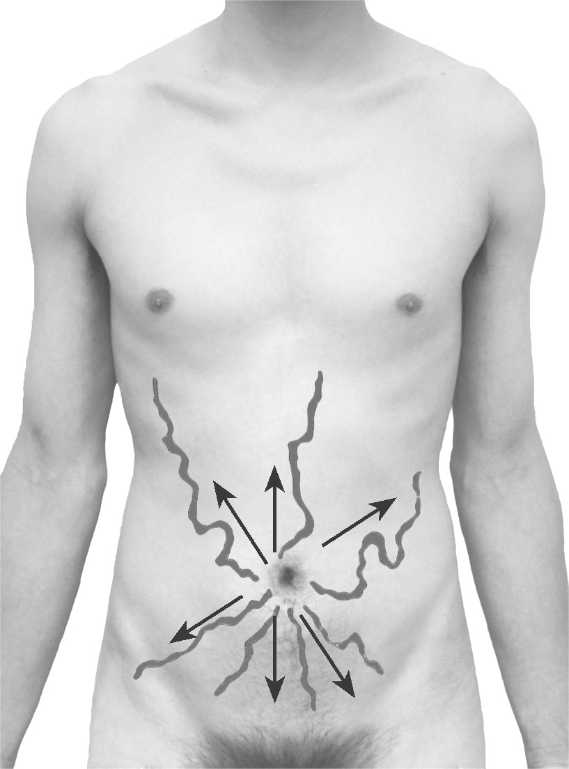 图3-5-1 门静脉高压时腹壁浅静脉的血流方向